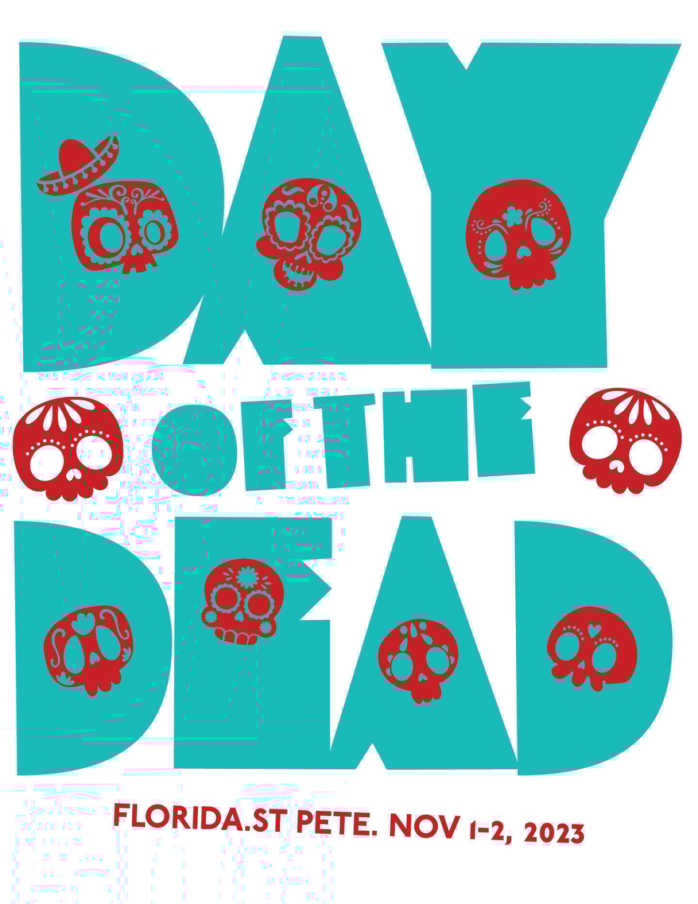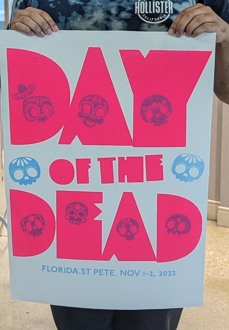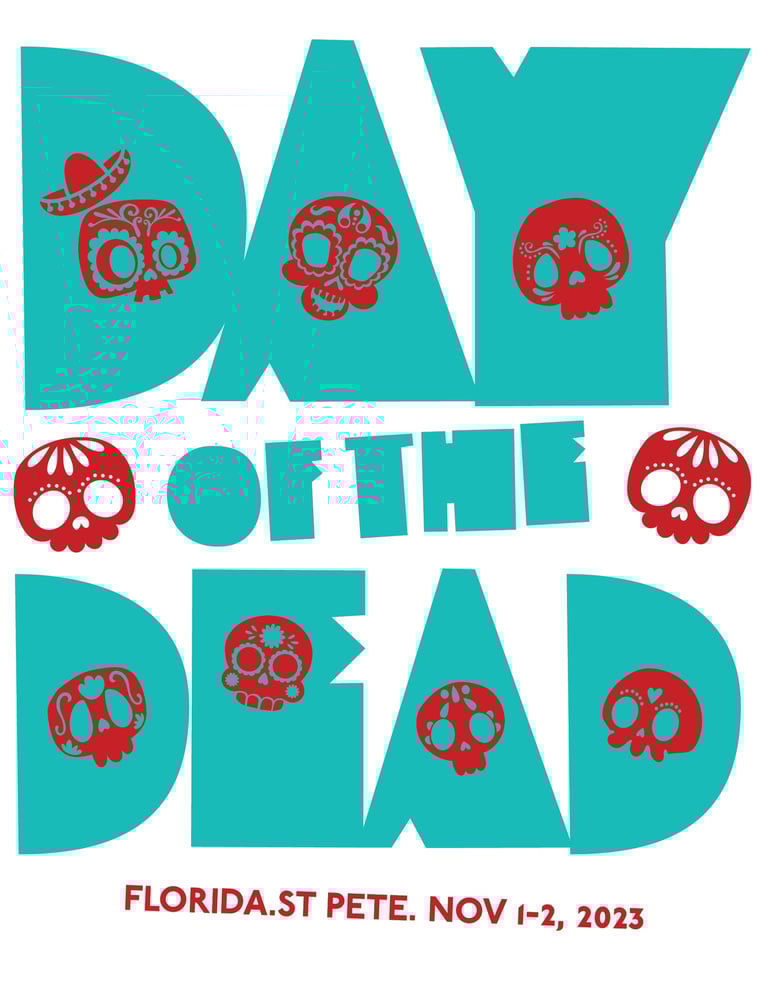 WELCOME TO THE DAY OF THE DEAD FESTIVAL HERE IN ST. PETEI Day of the Dead (Dia de Los Muertos in Spanish), is a celebration that focuses all around family; come on down and enjoy enriching music, dive into tradition, and honor your family. To help give the festival a visual rebrand, I was tasked with designing and screen-printing a poster design, a t-shirt design, and to also develop a social media campaign, promoting the festival.